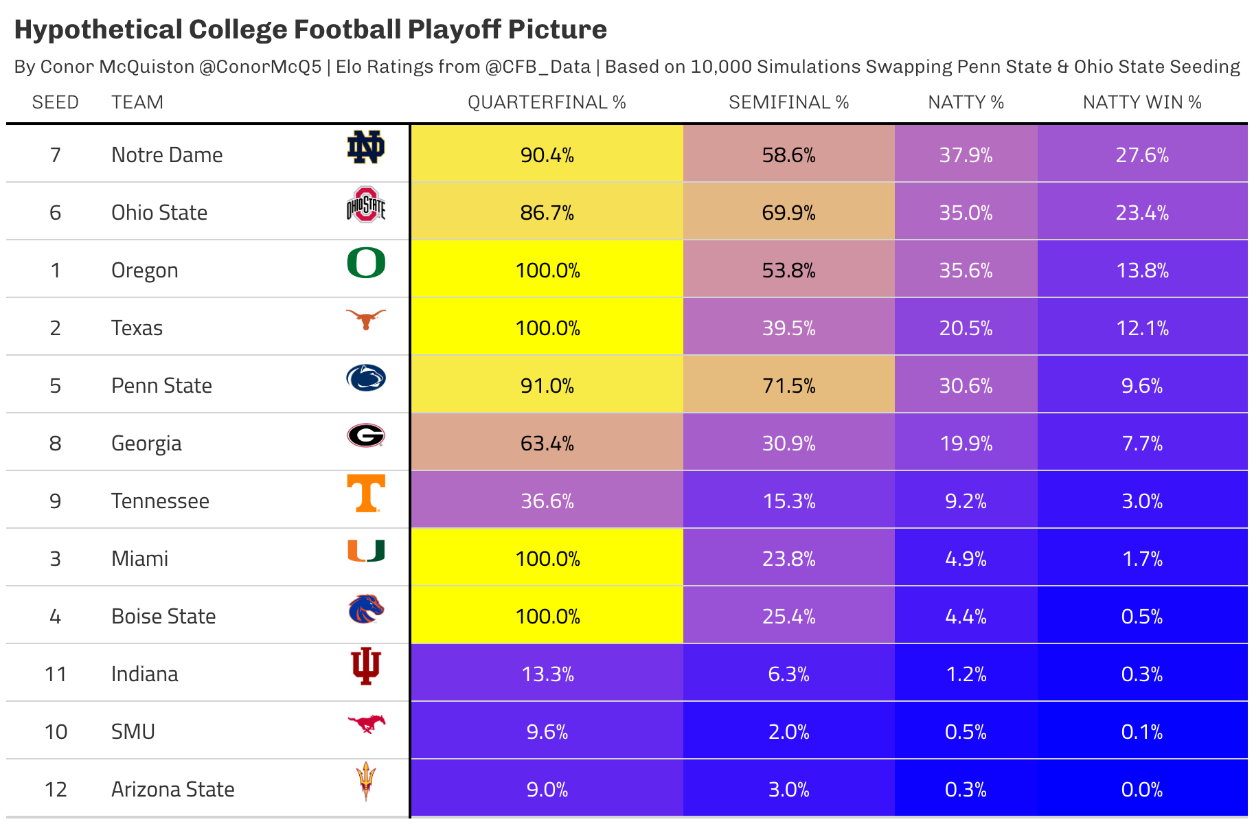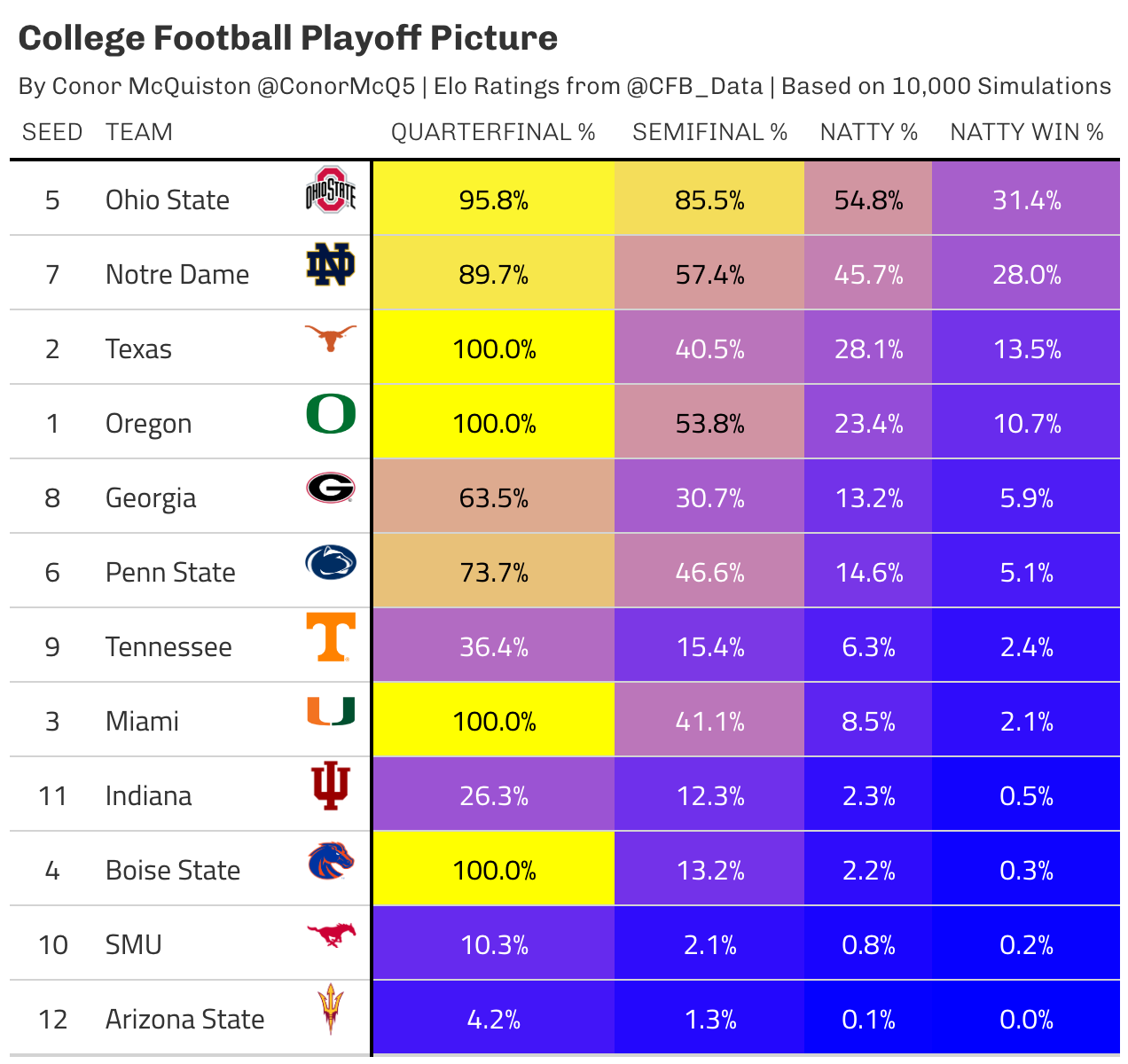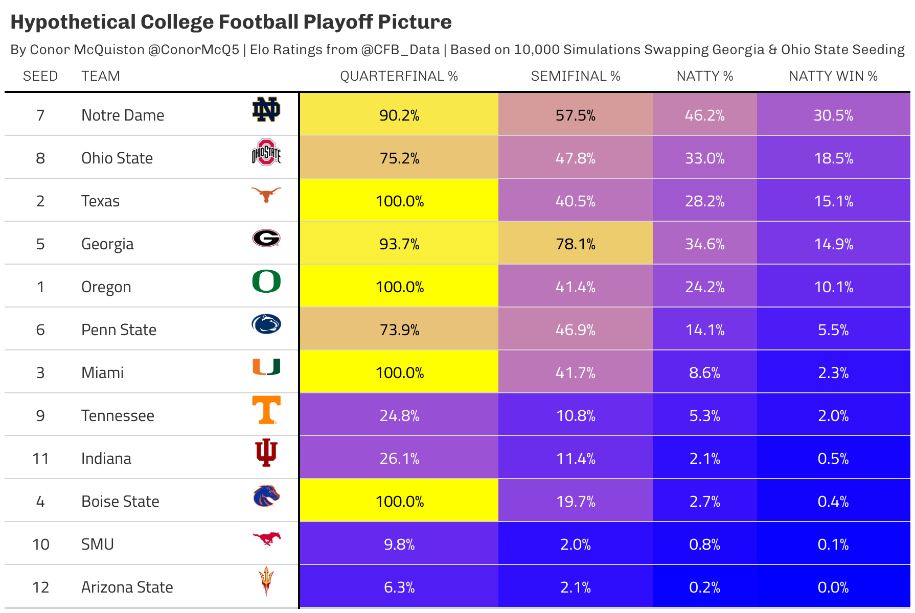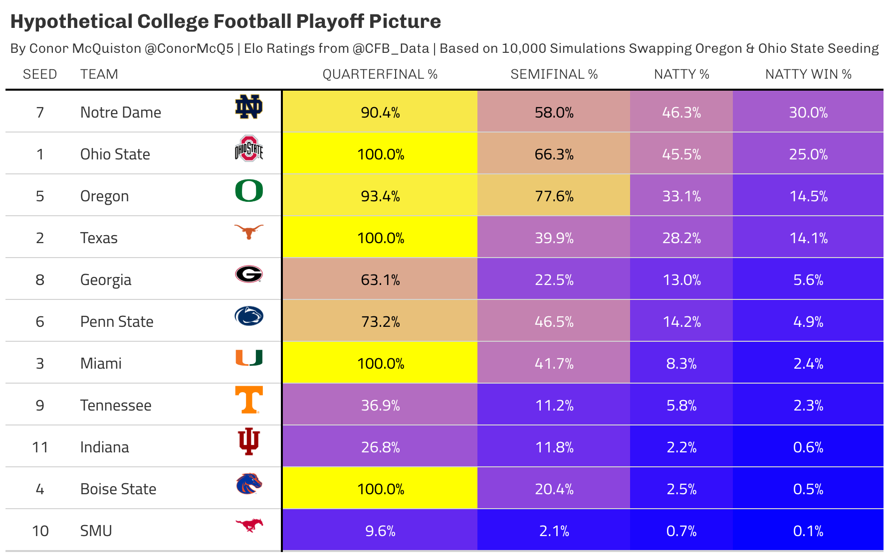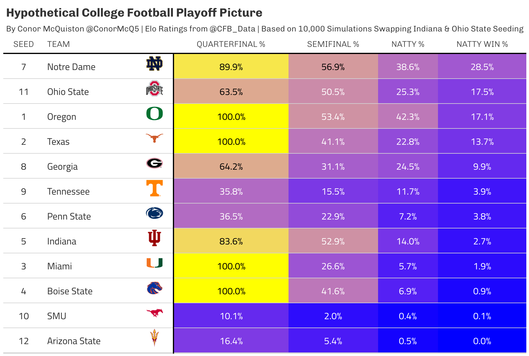 According to my simulations, Ohio State would remain a pretty sizable favorite in the current iteration of the CFP bracket. This is partially because they are a very good team, but also because of how easy of a path the #5 seed has in the bracket this year.