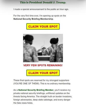 No, not a joke. Even as it most certainly is. This is an email sent to Trump supporters selling them access to US security briefings.