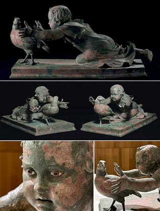 These two bronze sculptures date from the beginning of the Roman imperial era, somewhere in the first century AD. They show toddler girls trying to catch a partridge. Or possibly a pigeon?