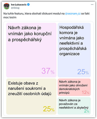 🤦♂️ Jo, Ivo, tahle fíčura fakt bude výborná. Dezolát se na to podívá a řekne si “Hospodářská komora je neefektivní a prospěchářka organizace” a protože to píše Seznam, tak je to pravda. To že jde o tvrzení a ještě jen 25% diskutujících vůbec neuvidí. Dost hodně i pro fatálně špatnou barevnost.