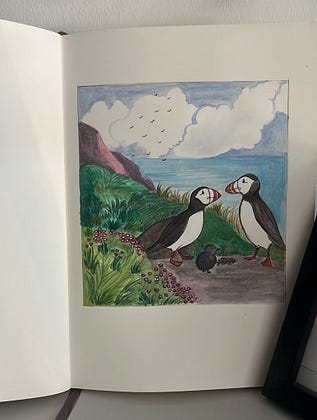 Art is at once a way out of the world, and a way to live in it better. A little painting I made today of a puffin family.