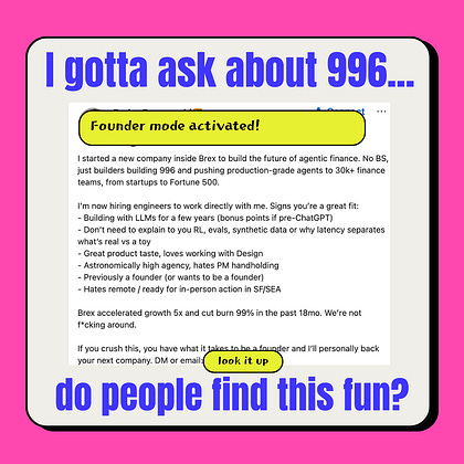 Sometimes writing about disrupting the status bro feels like a such a Sisyphean task. I publish my rant equating tech worker conditions to indentured servitude and 30 seconds later, a founder of a mega SV darling “unicorn” posts about only hiring people who can work 996 (so, parents are out), hate remote work and must commute in SF/SEA (so, 95% of the country has been disqualified), and “astronomically high agency” (equivalent of the 2010s “maverick” archetype where going rogue and not being accountable to anyone else is celebrated).