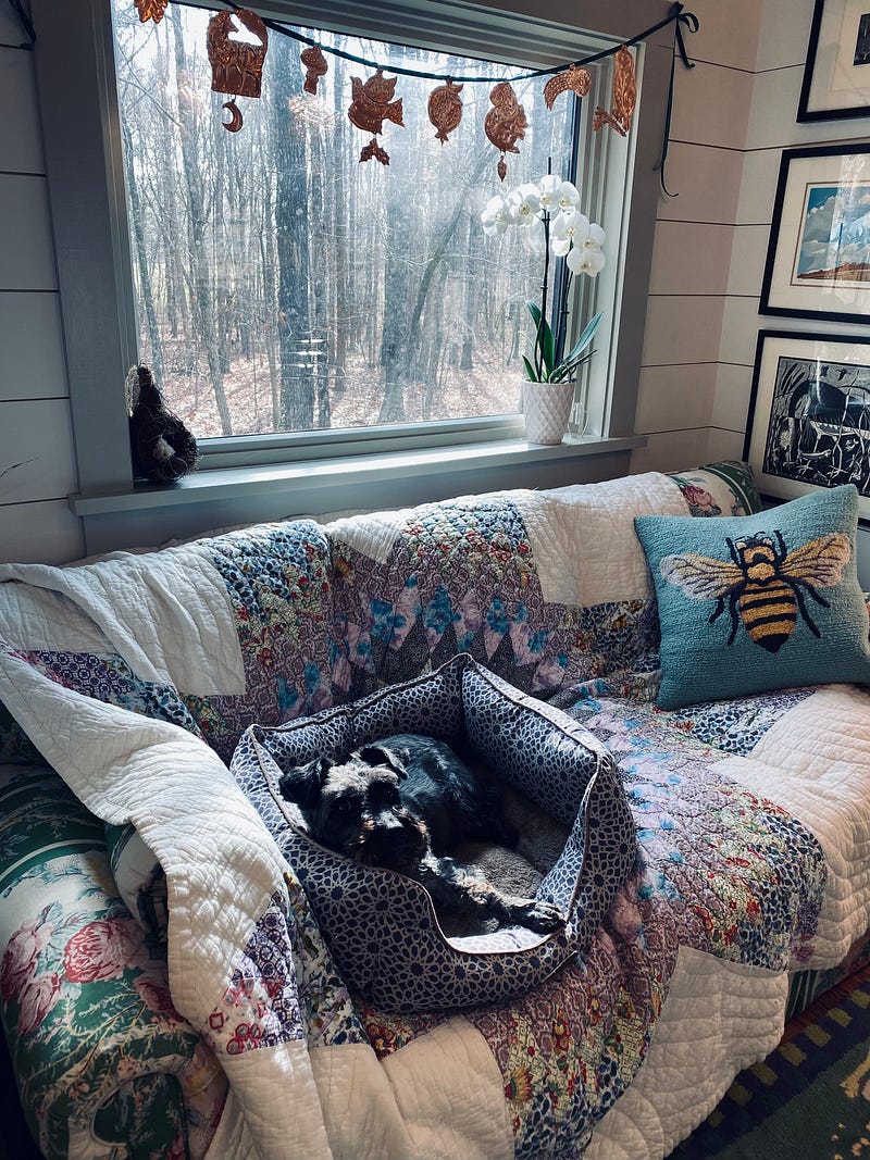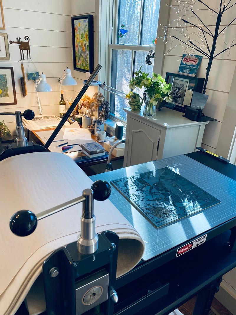 Good morning ! It’s cold outside but a good day to get some much needed printmaking done. “Osprey” block on the press to be printed in Phthalo blue, Jack supervising . 💙