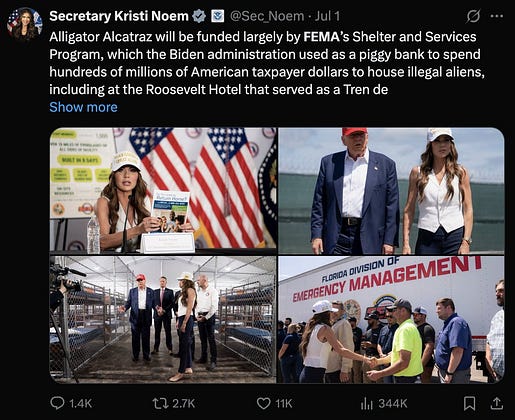 A few days ago, Kristi Noem was bragging about stealing money from FEMA to fund Alligator Alcatraz