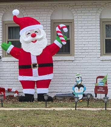 Maybe it’s just me, but I think Santa has overstayed his welcome at this house I passed on my way back from my run/walk at the park.