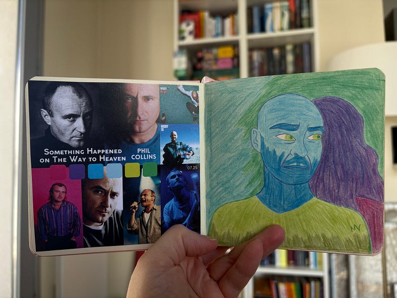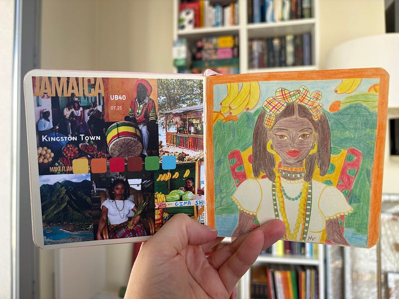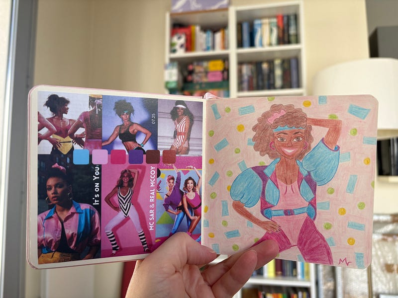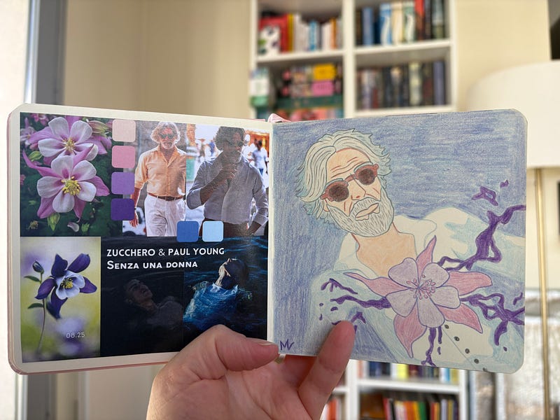Je trouve toujours cela intéressant de mettre les inspirations et recherches pour un dessin à côté de celui-ci. J’ai donc choisi de les ajouter à mon carnet spécial musique.