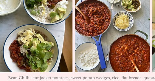 One for the weekend. Free favourite recipe. Big batch Bean Chilli - for quesadillas, for lime coriander rice, for sweet potato wedges, for jacket potatoes, for piling on toast with a crispy cheese topping, for a taco party….oh bean chilli, how I love you for being easy, delicious and cheap to make. Win, Win, Win