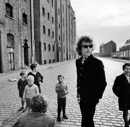 Bob Dylan photographed on the streets of Liverpool by Barry Fernstein on the 14th May 1966. Dylan was playing Liverpool's Odeon Theatre that evening.