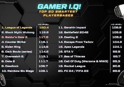According to WhichBingo, Rocket League and Fifa players have a quite low IQ, while players of strategy games (LoL, Black Myth, BG3, etc) have a quite high IQ. Measures are based on: verbal communication, mathematics, logic and visual reasoning. Across consoles, PC gamers have the highest IQ (114) while mobile phone gamers the lowest IQ (100).