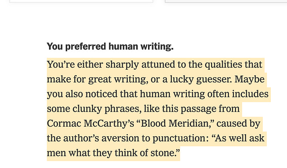 This, combined with the implicit assumption that AI writing is cleaner and therefore better, makes for such an odd commentary on the current state of human art in the age of ai. McCarthy is clunky now? The best prose stylist America has ever produced is clunky? Are all writers who bend the rules of grammar and punctuation clunky? Are you fucking illiterate? Do you understand what language is? That the rules are made up? That they change over time due to technological, cultural, and economic forces? Are we so devoid of culture that the New York Times, the largest print media company in the world, doesn’t understand what style is? Who needs transcendent explorations on the nature of Being, of our common humanity, of what it’s like to live a finite existence in a seemingly infinite cosmos, when we have the machines to think for us? As well ask men what they think of stone.