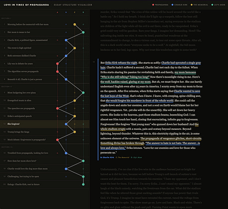 Just prototyped an essay theme visualizer. This one is for braided essays, so you can see how the main focus shifts around, yet still references other threads to keep the whole thing cohesive. Then you can click into any paragraph and see how those themes weave in at the sentence/word level. I’ve done stuff like this with static images, but it’s a different thing to read an essay with animated overlays and full context. Now realizing that I could go through classic essays and make unique interfaces for each, to focus on different patterns. And then maybe, those same interfaces could help you see things in your own work? I have a lot of experimenting to do; feels like I need to enter a divergence phase, and then see what I can bring back into the Essay Architecture core app.