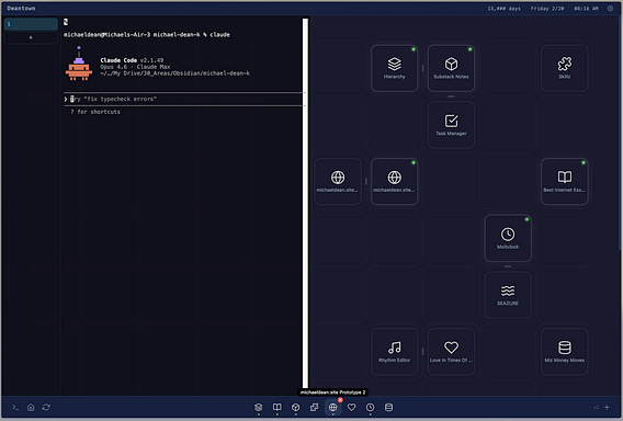Weird post-midnight project: built myself an operating system. Not really, but really. It's just an app that finds all the other apps I've built in my 80_code folder, but then displays them as icons in a Mac dock + desktop GUI. It’s an easy way to see/use/remember what would otherwise be scattered. Lots of weird features, like the clock changes to a random time every 0.5 seconds, and instead of the date it tells me how many thousand days old I am. If you click the "Fun?" toggle, it lets snakes loose. What's trippy is I also built a multi-tab terminal inside of it, so I can Claude Code to code the code I'm coding (actually writing 0 code). Seriously though this is becoming my Notion replacement, a place to write/plan/do, except with complete interface flexibility, and all-local data. Currently writing this note from within the OS. The unlock for me was in realizing the power of local data over cloud apps. Feels like owning vs. renting. When you have everything in a single sandbox on your computer, you can spawn interfaces to help you with anything, and they can be far more idiosyncratic than anything you'd ever find in a mass-market product. Notion doesn't have snakes.