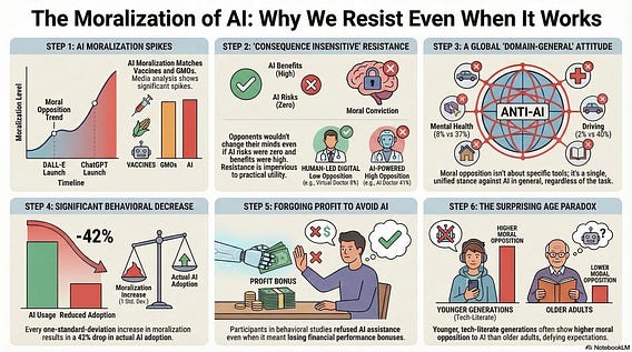 The behavioral data make this concrete: a one standard deviation increase in moralization scores predicted a 42% drop in actual AI usage, even when it would have benefited that person personally. The conviction preceded the behavior by up to 573 days.