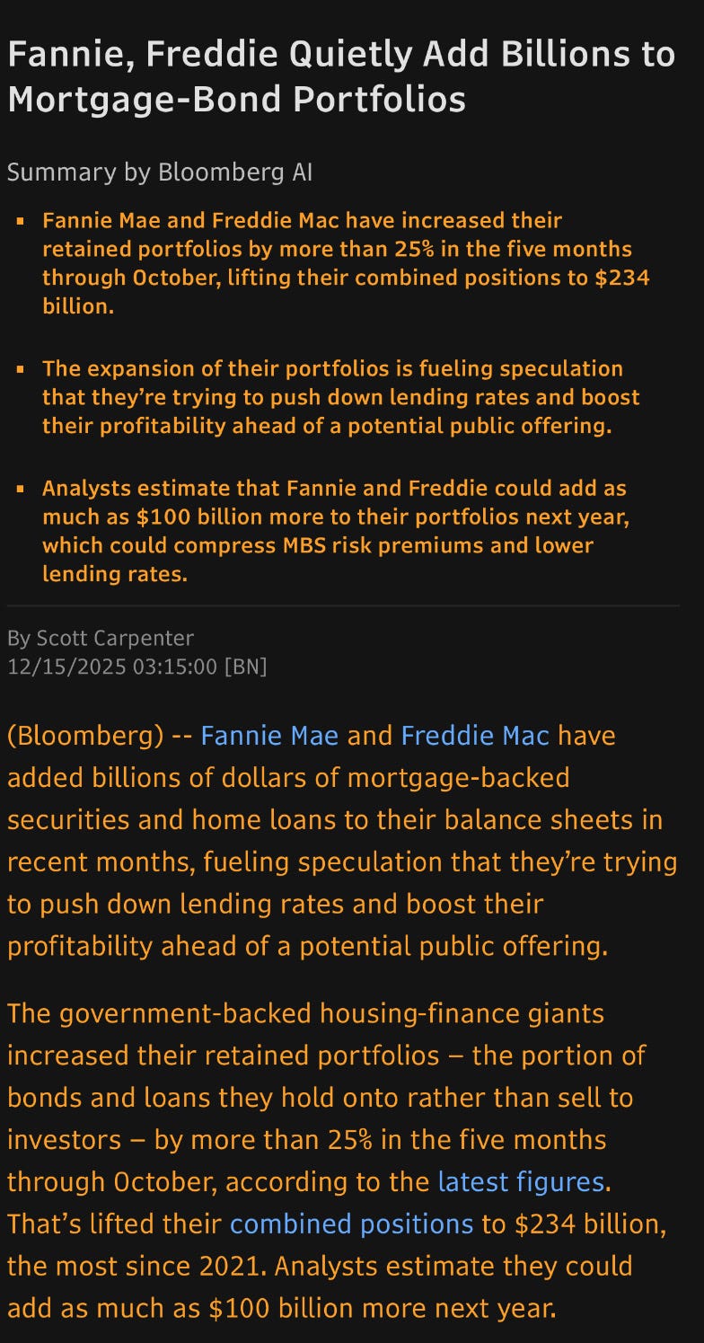 Some may see this as a negative perhaps due to Trump’s heavy-handed control being in evidence, but my thought is this makes it more urgent to recapitalize Fannie and Freddie through the IPO process.