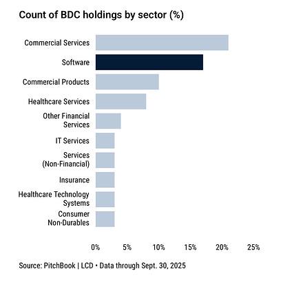 In the chart below, the private credit behind data center buildout, chip financings etc and generally backing the AI boom would be represented by both Commercial Services and IT Services. It might even be in Software to an extent.