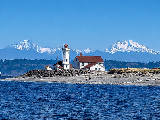 Fort Worden Lighthouse on a perfect bluebird day here in the PNW, where we also watched two eagles battle it out overhead.