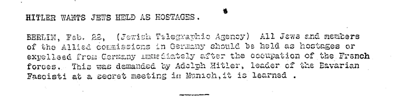 1923: Brief news item in JTA: "Hitler Wants Jews Held As Hostages - All Jews and members of the Allied commissions in Germany should be held as hostages or expelled from Germany immediately after the occupation of the French forces. This was demanded by Adolph Hitler, leader of the Bavarian Fascisti at a secret meeting in Munich, it is learned." jta.org/archive/hitler-…