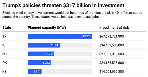 In a single sentence, the Trump administration just announced that it might block every wind energy project in America. The cost of this extreme policy could cost the US $317B in lost investment.