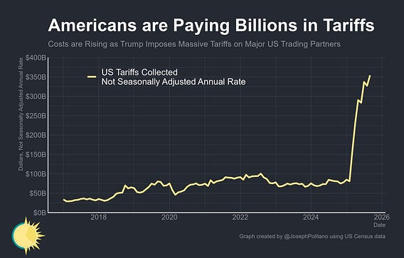 The cost of Trump's tariffs continues to hit new highs in data released this morning—import taxes are running at a $350B/yr pace for the first time in history, nearly 5x what they were this time last year