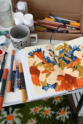 Enjoying a box full of new art supplies.