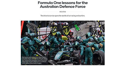 “Both Formula One and military organisations are fighting an intellectual battle to come to grips with a new era in their respective endeavours.” What might these two demanding undertakings offer each other so that each might remain at the leading edge of their endeavours during a disruptive period.