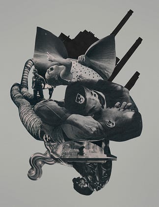 Analog collage created with images hand cut via xacto knife from vintage magazines. The finished image size is roughly 12 x 15 inches and was completed May 2017.