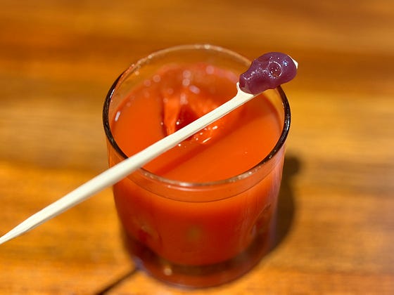 I’m drinking a weird Mexican cocktail, with an onion-flavored skull gummy.