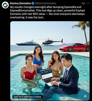 AI slop of the moment: Ad for expired domains depicts the ideal customer -- a dude smart enough to buy expired domains, own expensive vehicles and find himself surrounded by gold diggers but so dumb he's wearing a suit in the pool and typing sideways. x.com/KarmaDomains/stat…
