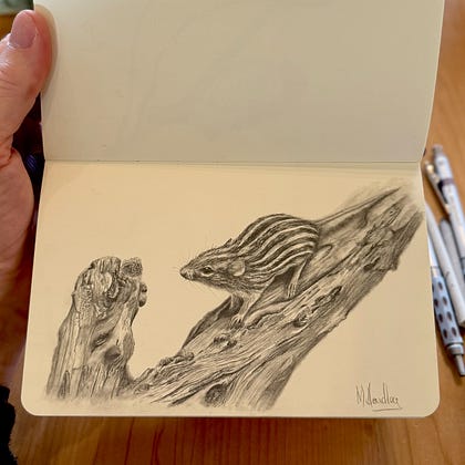 Finally finished this Barbary striped grass mouse using Pentel Graphgear 1000s (.3 and .5). I used a tortillon for the blur and BluTack for those tiny highlights. I honestly might enjoy drawing the bark more than the mouse. Reference by the great Edwin Butter.