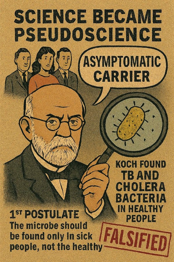Logically, Koch knew that correlation didn’t equal causation. But when he found the TB and cholera bacteria in healthy people, his postulates failed. Instead of abandoning the hypothesis, he invented the “asymptomatic carrier” to save it. That’s when science became pseudoscience.