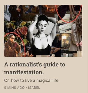 I’m going marty supreme mode on my most recent essay: rationalist’s guide to manifestation. new year’s day. you gotta read this. I’m telling you. original essay. everyone says they want an original essay, here it is. it’s a story about greatness, how to manifest our own greatness. you’re gonna love it.