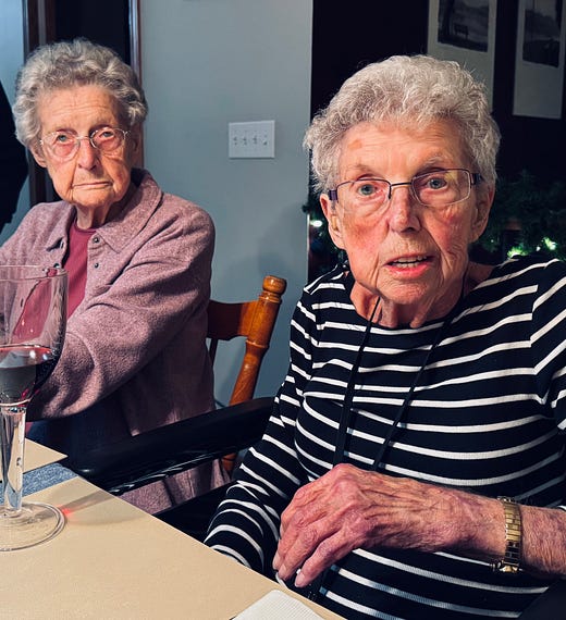 We had an early Christmas dinner with my mom, her 98-year-old sister, and family I hadn’t seen in ages (and in a few cases, ever). That’s my aunt and my mom in the photo.