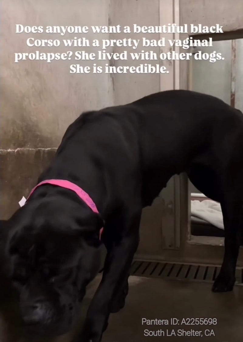This glorious two-year-old Cane Corso female (spayed) was surrendered by her owner with a prolapsed vagina. Since then she's become sick. Have you ever wanted to own a black panther? Well this dog looks a lot like a black panther hence her name I guess and she's a stunning animal. What is wrong with people? How could you dump your best friend like that? She needs someone to adopt her or at the very least foster her to get her proper medical attention. These are very expensive dogs. This poor animal, she deserves so much better than this. Out-of state-adoption is possible and some shelters provide supplies to fosters. I'm sharing this for visibility and I would be grateful if you could do the same. If you or anyone you know could help this poor sick girl please contact South LA Shelter in California as soon as possible. Every day matters and this dog's life really matters. Trying to save an animal a day.