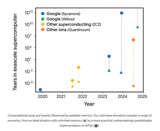 Its vertical axis showing “years on an exascale supercomputer” vividly illustrates the immense computational gap Willow surpasses — from a few minutes on Willow to billions-of-years-long classical estimates.