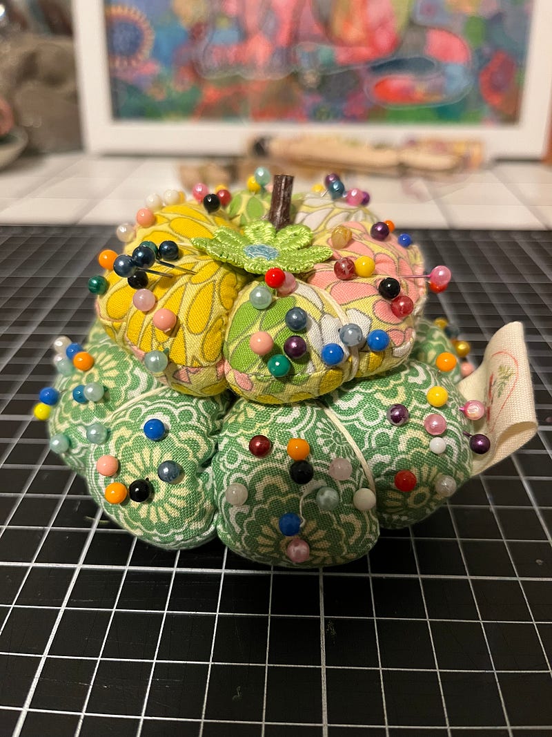 Like this pumpkin pincushion which was not on my agenda but seemed like a good thing to do when my old pincushion fell apart.