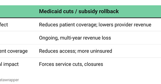 Montana will lose between 4.8 and 6.1 billion due to the Republicans cuts to Medicaid. That long-term predictable income from Medicaid, that covers patient care, will not be offset by the approximately 233 million Montana is set to receive in one year that will go to buildings, Electronic Health Records (EHR) systems, and telehealth equipment. The lights are on, but no patients will receive care in our rural clinics.