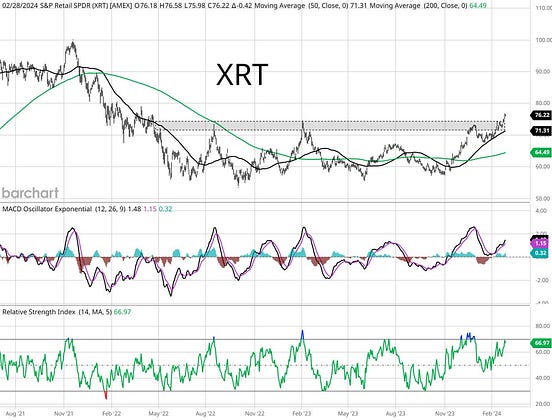 The XRT retailers ETF is breaking to the upside of a range extending back over two years.
