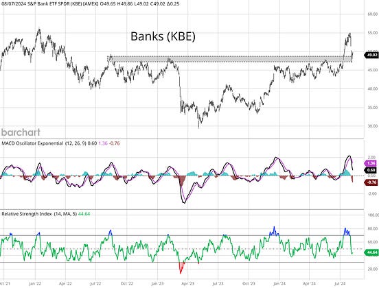 Like with banks in the KBE chart below. Common to see a breakout back test levels as support.
