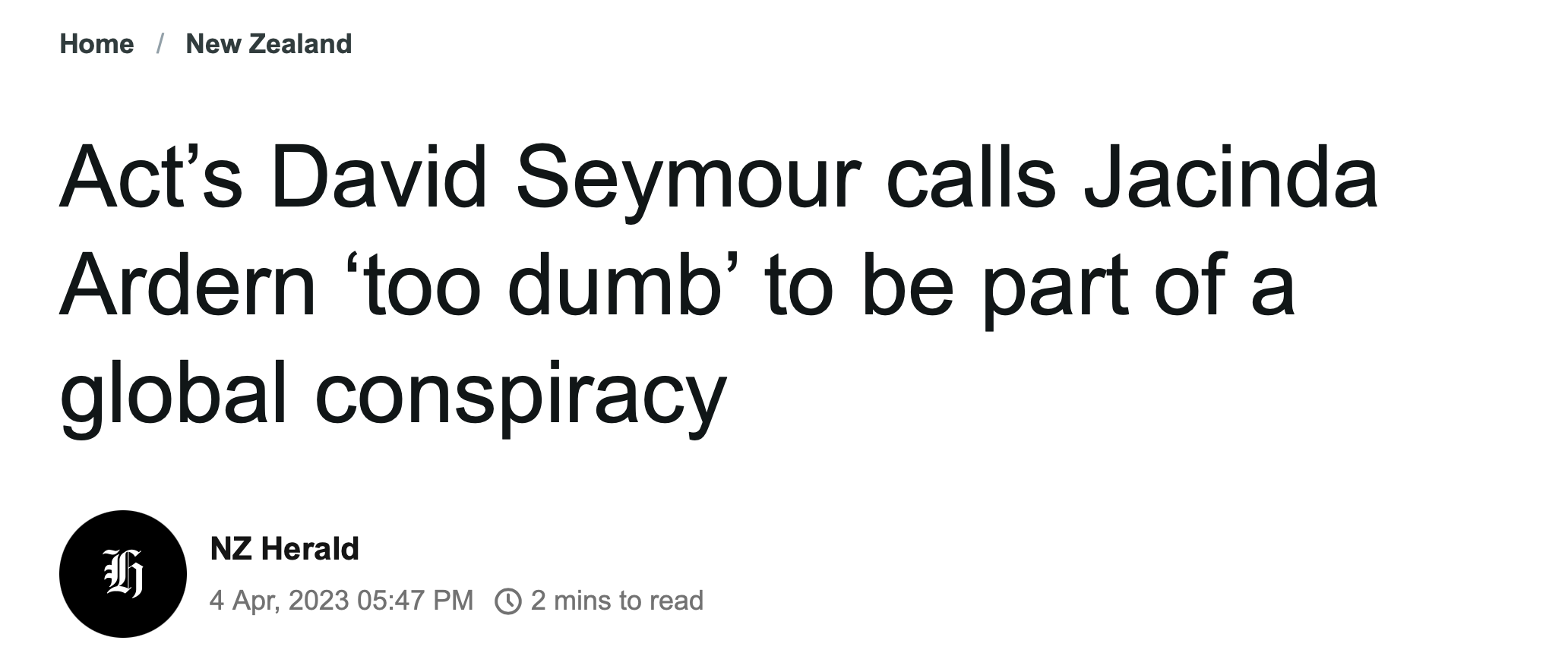 Last year, David Seymour said Jacinda Adern was "too dumb" to keep up with a global conspiracy and would "screw it up".