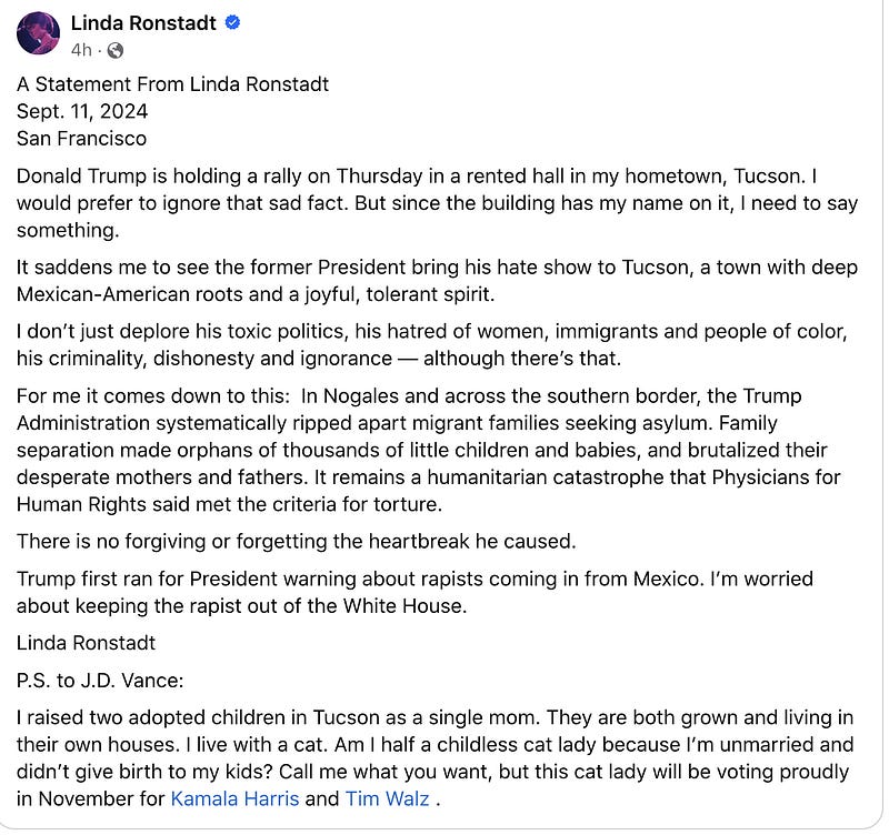 Linda Ronstadt is raising her voice to condemn Donald Trump and the “hate show” rally he intends to bring to the Tucson venue bearing her name.