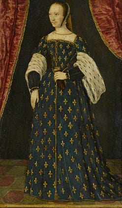 The Louvre is home to this sixteenth-century portrait of Queen Claude of France by an anonymous artist. She’s depicted in an exquisite gown decorated with fleurs-de-lis. Learn more about queenly clothing in 16th-century England and France in the latest episode of Talking Tudors!