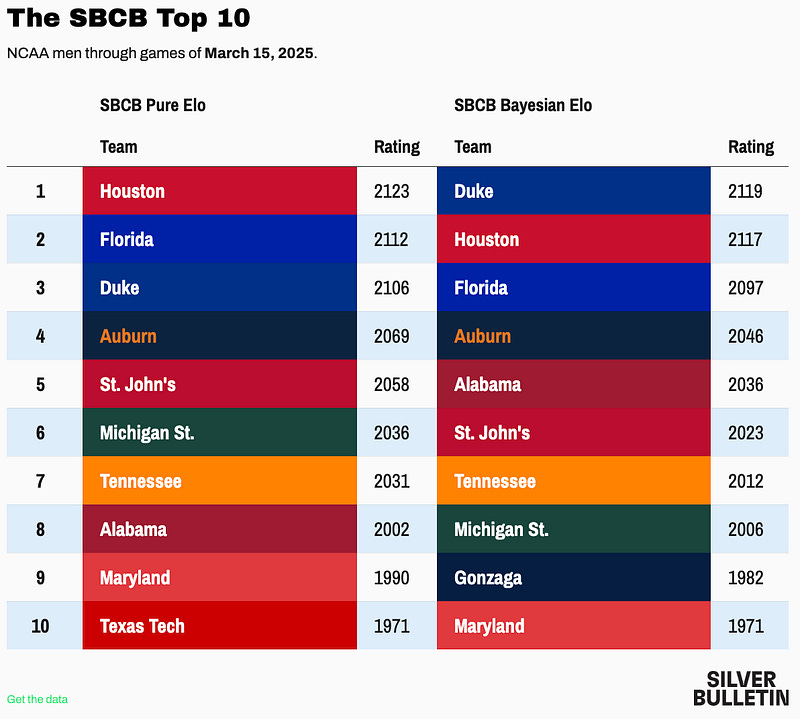 The NCAA tournament forecast is the longstanding 2nd-most popular Silver Bulletin/538 feature after the election forecasts and there's some legacy "code" in there (if you want to dignity complicated EXCEL formulas with that term lol) that I wrote in 2002 because I wanted to win my office pool.