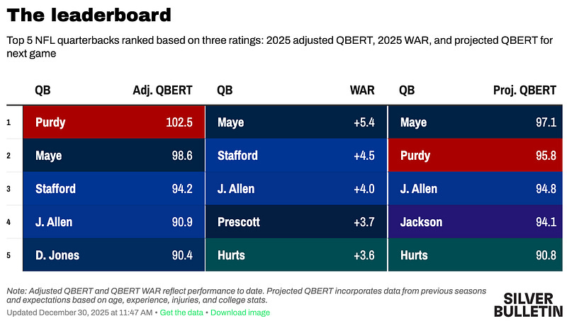 Drake Maye just had one of the best starts in NFL history. And QBERT now has him as the best QB in the league. Not just the MVP this year, but with the highest forward-looking rating in the league, too.