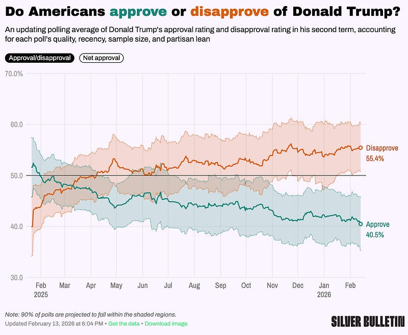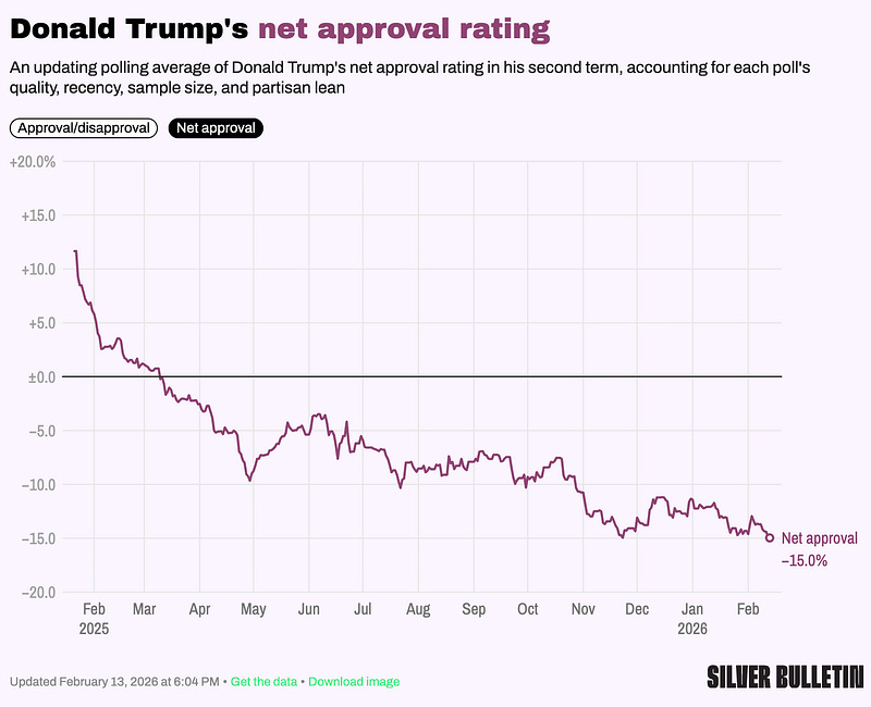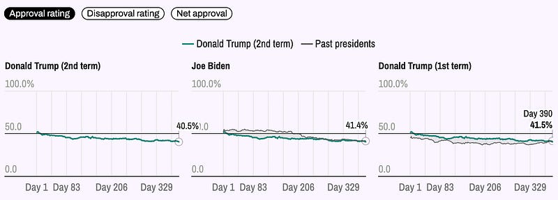 Can be some noise here. But new 2nd-term Trump approval low in our tracking. We haven't had a lot of popular presidents lately. But he's also now a hair below Biden and Trump 1.0 at comparable points.