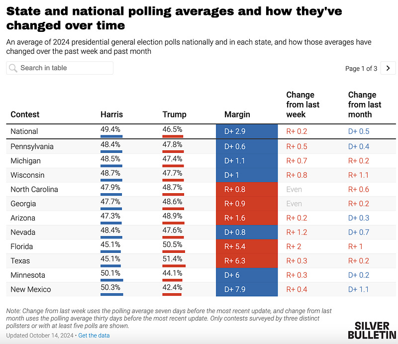Today's update. As you can see, a little bit of erosion for Harris in the Blue Wall states over the past week. Only a 1/2 point but half points matter. Don't think it's easy to say which campaign you'd rather be at this point: the race is a pure toss-up.