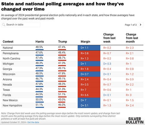 PM update. This morning's batch of polls was pretty good for Harris but the afternoon was stronger for Trump. All pretty incremental at this point. Still, a gap is opening up between PA and MI/WI, and Harris may need backup plans if the Blue Wall is split.