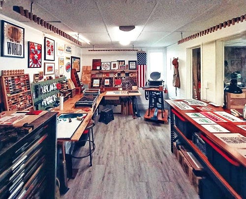 šØ This is my little garage studio where I do my analog graphic design work, playing with antique wood type fonts, relief printing, and write for Substack and myself.