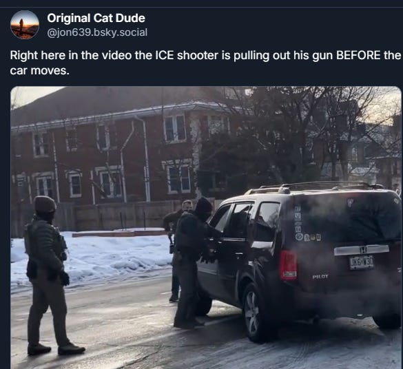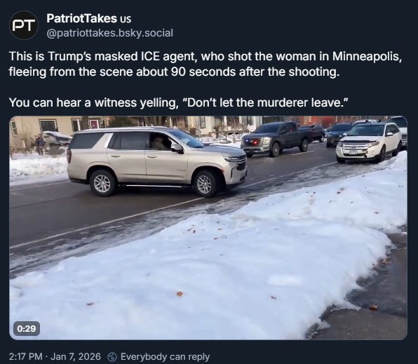 She was Renée Nicole Good, and she was a mum to a 6-year-old boy and a widow, so there is now a little boy who has lost his birth parents, and Good’s partner is now a widow who has to keep it together … because the most important woman in their lives was killed over nothing by a paramilitary force.