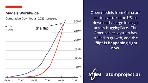 America needs to take open models more seriously. This summer the early lead in open model adoption of the US via Llama has been overtaken by Chinese models.