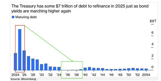 1) US has 7 Trillion $ of Debt which it has to pay in next 6 months in 2025. If the US cannot pay then it has to get it Refinanced.